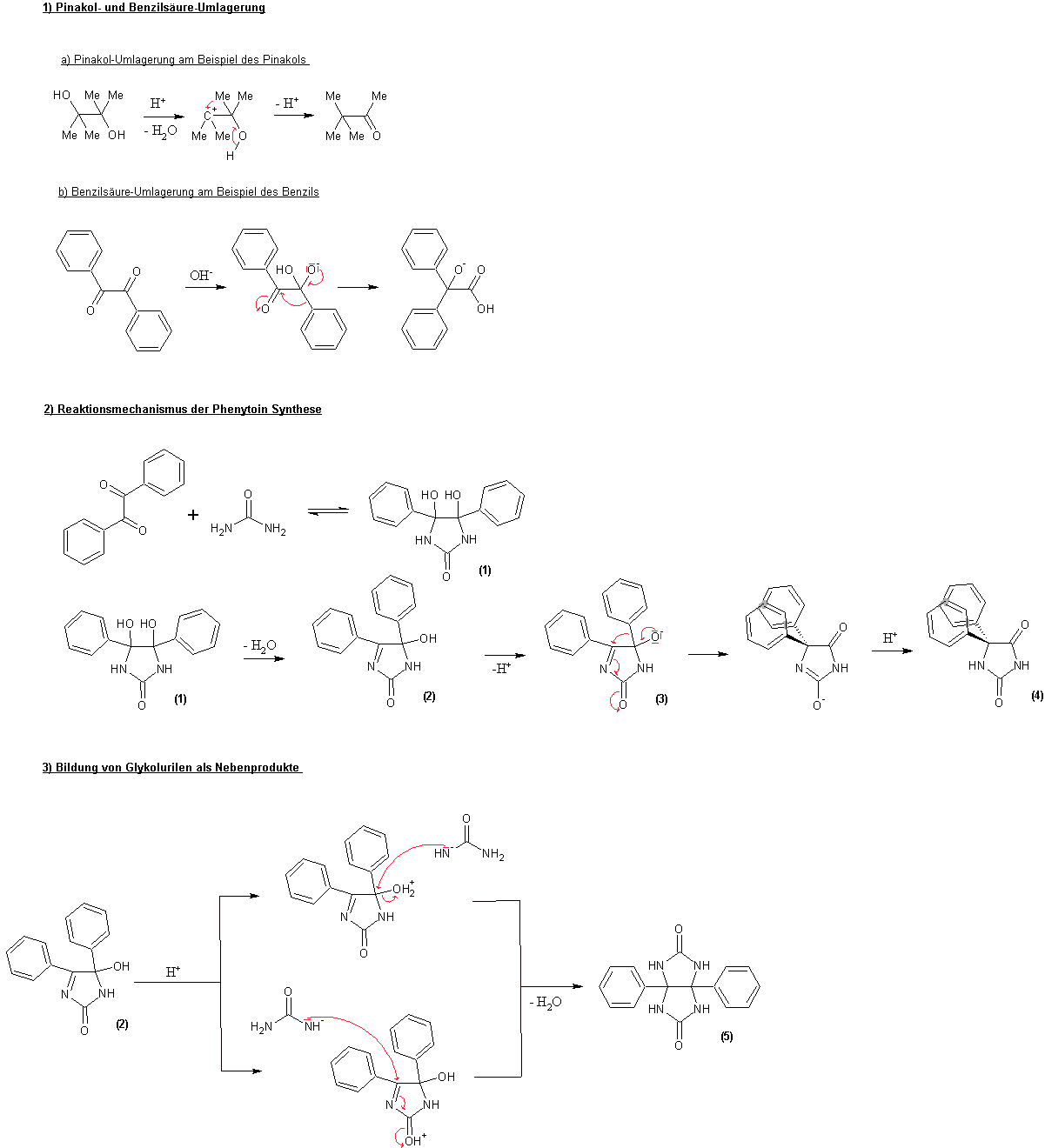 Zur Reaktion:Die nachfolgenden Erklärungen stammen aus dem Artikel „Die Phenytoin-Synthese des H.Biltz“ von Gerhard Schwenker, Agan S. Dajoh und Sonja Bernhart, welcher in der Fachzeitschrift „Pharmazie in unserer Zeit“ (15. Jahrg. 1986 / Nr. 6) veröffentlicht wurde.