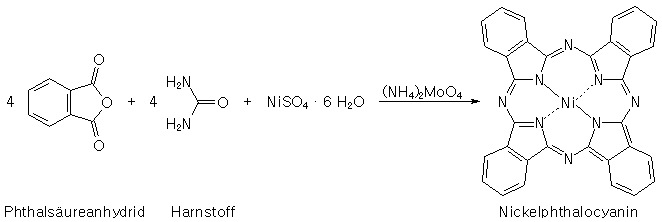 NiPC-upload-01.gif (7.29 KB . 662x222 - angeschaut 2086 Mal)Zur Reaktion: Phthalsäureanhydrid kondensiert im Beisein von Ammoniak zum Phthalocyanin-Grundkörper. Katalysiert wird die Reaktion durch Ammoniummolybdat. Harnstoff liefert durch seinen Zerfall oberhalb der Schmelztemperatur von 133 °C den nötigen Ammoniak. Eine Präparation ausgehend von Phthalsäure wäre alternativ ebenfalls möglich.