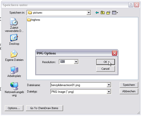 attachment08.png (138.67 KB . 886x637 - angeschaut 2154 Mal)Schritt 7: Datei -> Speichern als -> Dateiname (im Beispiel "benzylidenaceton01"), Dateiformat "PNG Image" (Options: Resolution 110), in ../synfiles/pictures