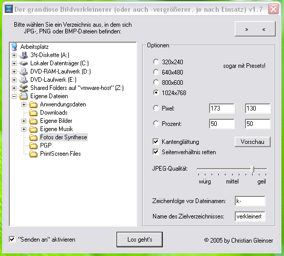 Es gibt unzählige Bildbearbeitungsprogramme, die sich für die Größenkonvertierung eignen. Das Beispiel zeigt die Verwendung des kostenlosen und sehr simplen Programms „Der grandiose Bildverkleinerer“. Es kann unter folgender Adresse kostenfrei heruntergeladen werden.
